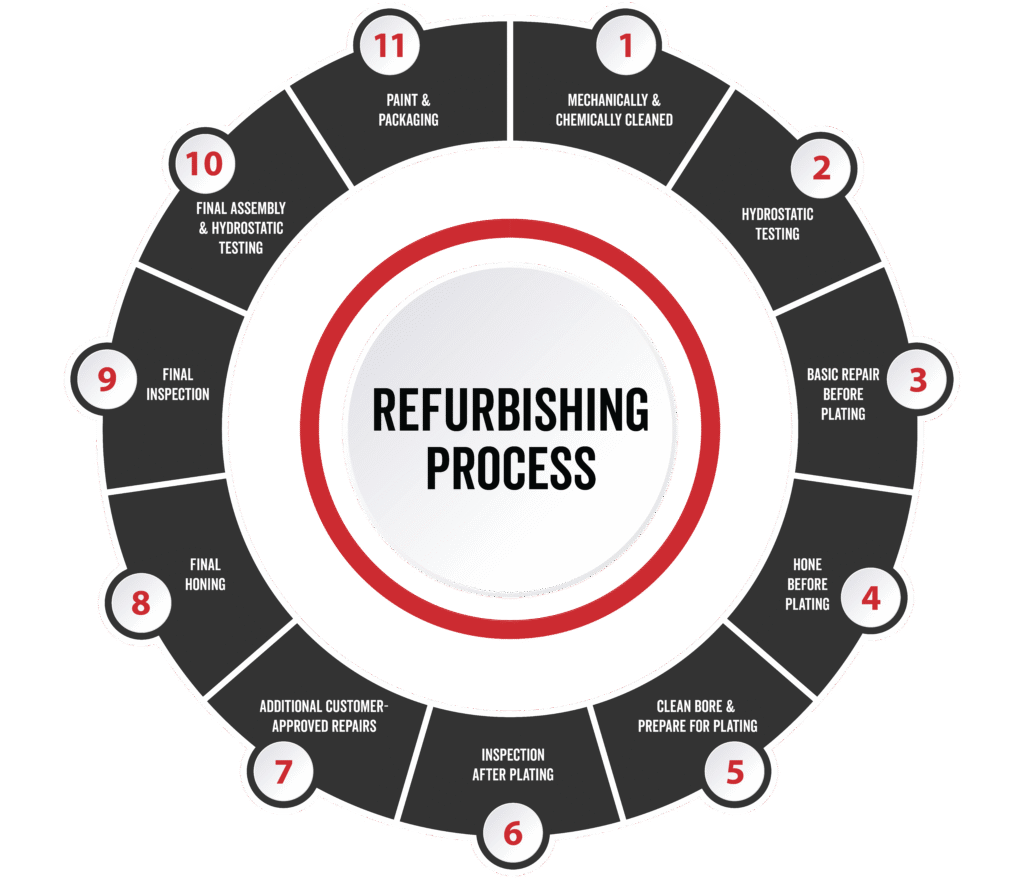 Each ICP cylinder repair begins with meticulous receiving and dimensional inspection, followed by precision honing and proprietary chrome plating. Our controlled in-house environment ensures repeatable performance, while Cooper’s Quality Control Toolkit verifies every detail before final delivery.